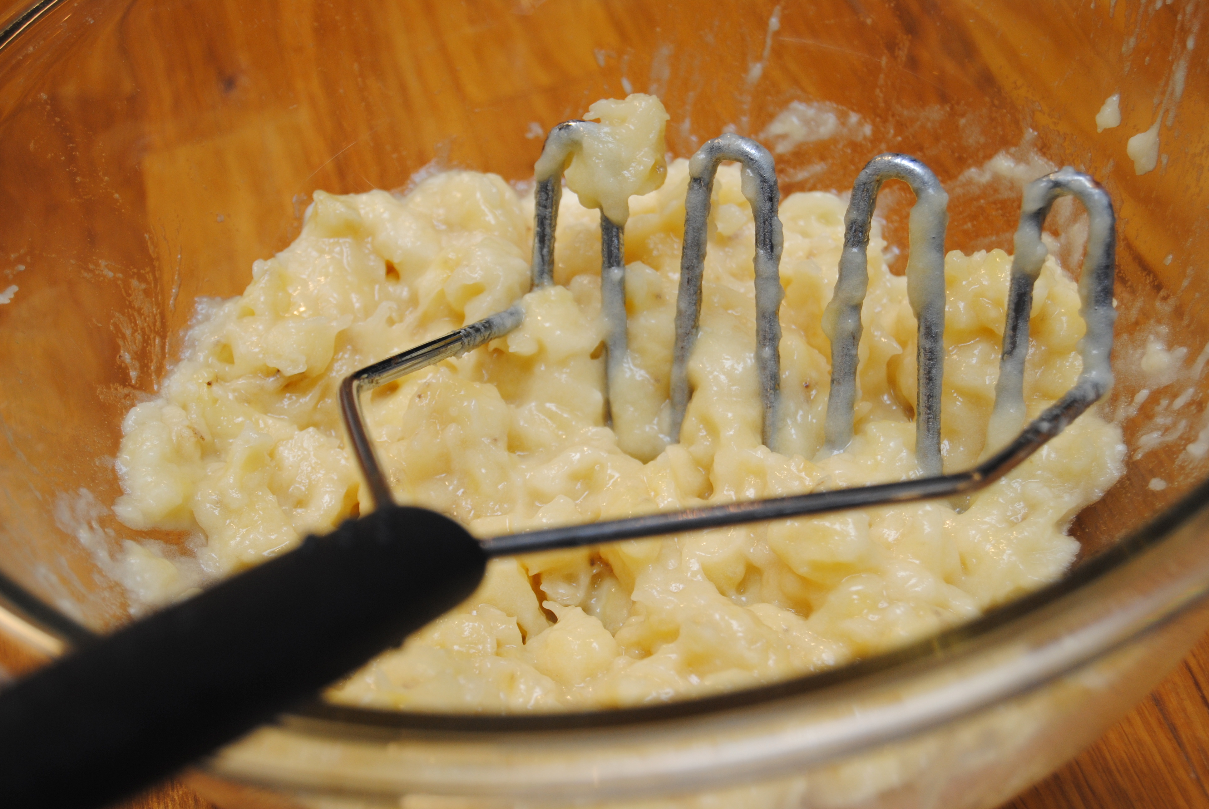 4.) Turn speed to low, add eggs one at a time until combined.  Stir in vanilla, mashed bananas, and sour cream on lowest speed.