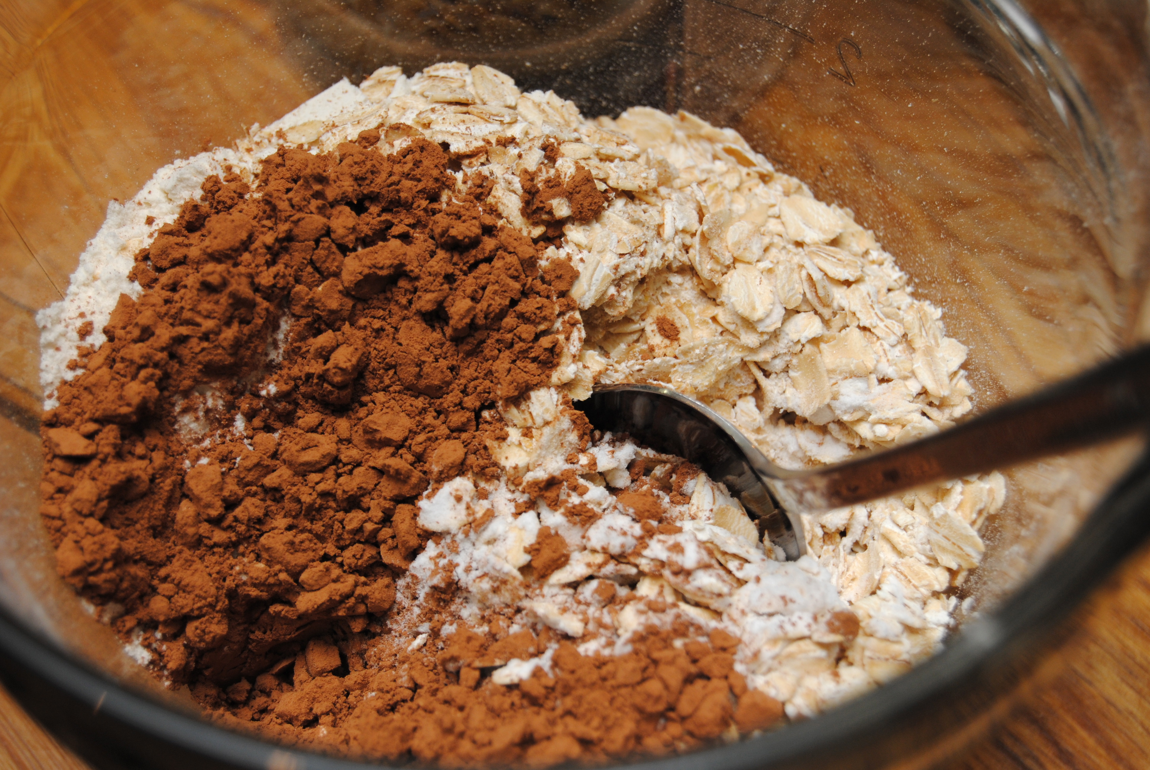 2.) In a bowl, combine flour, oats, baking soda and cocoa powder. Set aside.