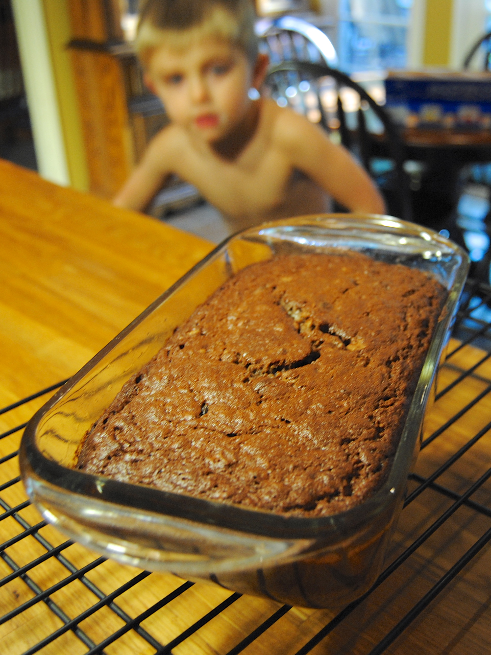 It was chocolate banana bread for breakfast in our house this morning! It’s like a cross between brownies and banana bread and is so good! I found this recipe on Pinterest and stuck to it exactly (except for cooking time – in an effort to speed it up, I went 375 for 60 minutes, and it worked out just fine!). Enjoy!