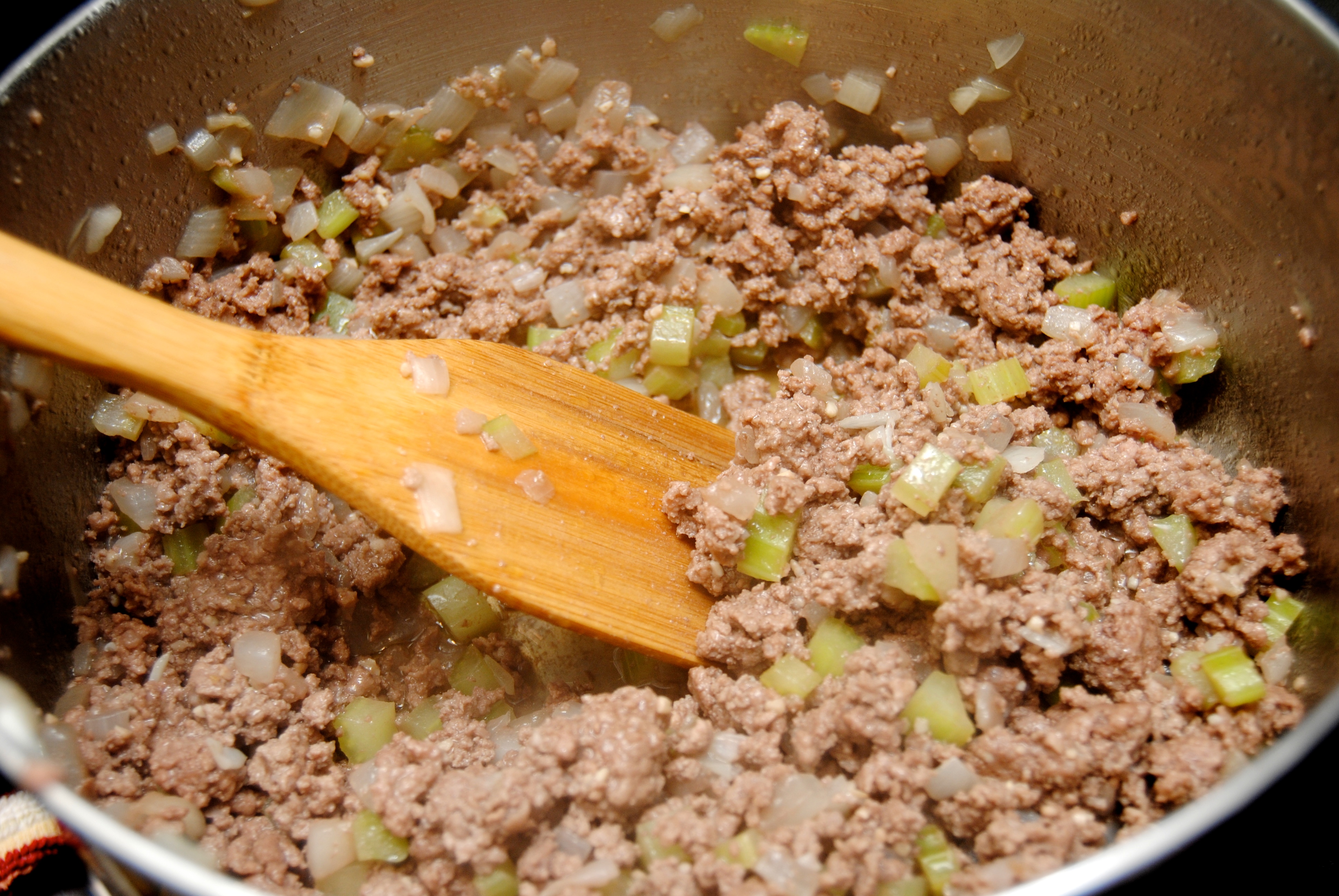 1.) In a large soup pot over medium-high heat, add ground beef, onion, celery and garlic and cook until meat is brown. Use a spatula to break apart the meat as it cooks. Drain any excess fat.